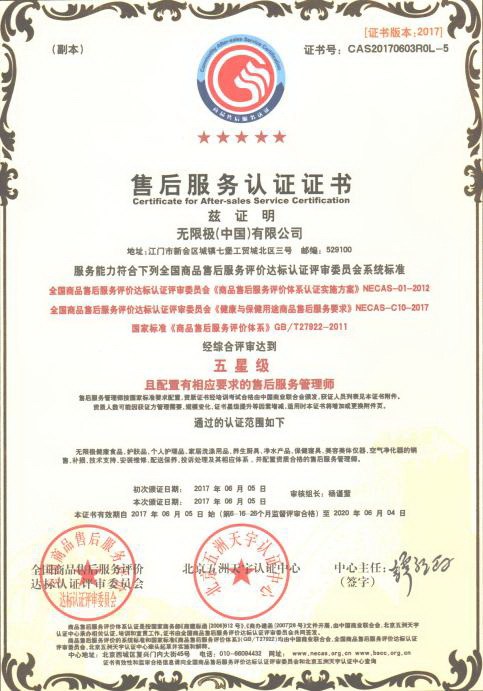 日前,经权威机构认证,无限极售后服务水平达到相应的国家标准,摘下国内售后服务的桂冠——五星级售后服务认证。此前,海尔、美的等知名企业也获得过此认证,无限极是行业内第一家获得此项认证的企业。