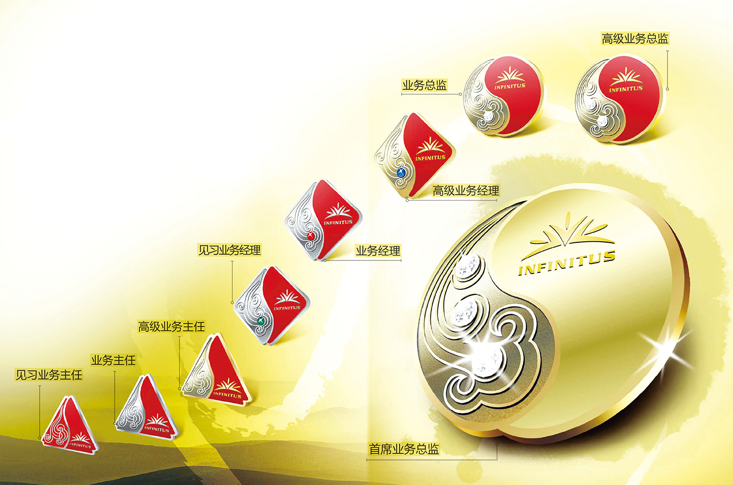 公司设9个晋升职级,由低到高依次为见习业务主任、业务主任、高级业务主任、见习业务经理(2013年增加)、业务经理、高级业务经理、业务总监、高级业务总监和首席业务总监。