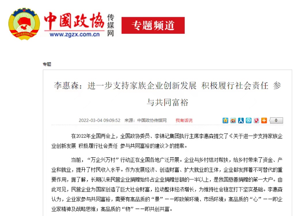 在2022年全国两会上,全国政协委员、李锦记集团执行主席李惠森提交了《关于进一步支持家族企业创新发展 积极履行社会责任 参与共同富裕的建议》的提案。