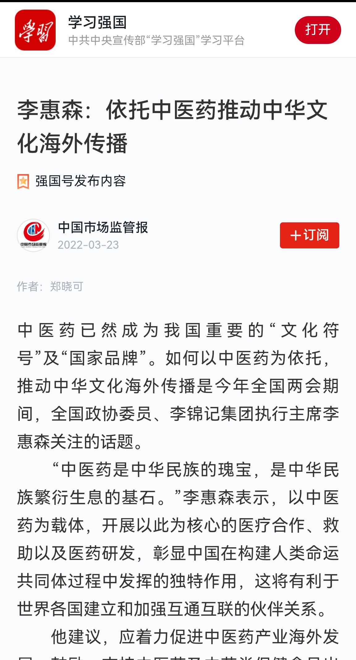 为此,李惠森提交了《关干以中医药为依托推动中华文化海外传播的建议》的提案,建议着力促进中医药产业海外发展、鼓励、支持中医药及中药类保健食品出口,推动中医药人才及企业“走出去”,充分发挥华侨华人资源优势,引导及助力华商在海外发展中药产业:着重加强政策法规、市场准入等方面的辅导,帮助中医药企业适应国际化市场,打造有影响力的中医药品牌。同时充分利用中医药跨国企业的文化传播优势,借用各类载体讲好中医药故事,将中医药文化与企业产品相结合,提高国外民众的中医药产品认同,并通过尊重多元文化积极探索中医药文化与各国本土文化融合方式,增进中医药文化的民心认同。