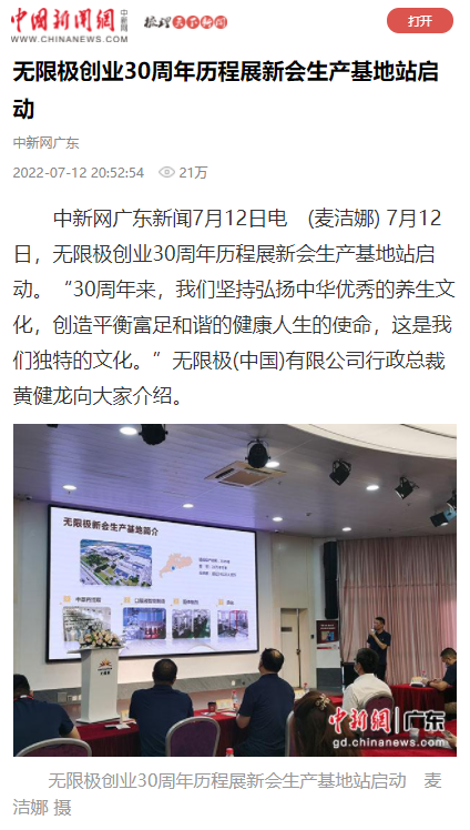 中新网广东新闻7月12日电 (麦洁娜) 7月12日,无限极创业30周年历程展新会生产基地站启动。“30周年来,我们坚持弘扬中华优秀的养生文化,创造平衡富足和谐的健康人生的使命,这是我们独特的文化。”无限极(中国)有限公司行政总裁黄健龙向大家介绍。