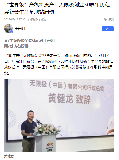 “30年来,无限极始终坚持走一条‘难而正确’的路。”7月12日,广东江门新会,在无限极创业30周年历程展新会生产基地站启动仪式上,无限极(中国)有限公司行政总裁黄健龙在致辞中如是说。