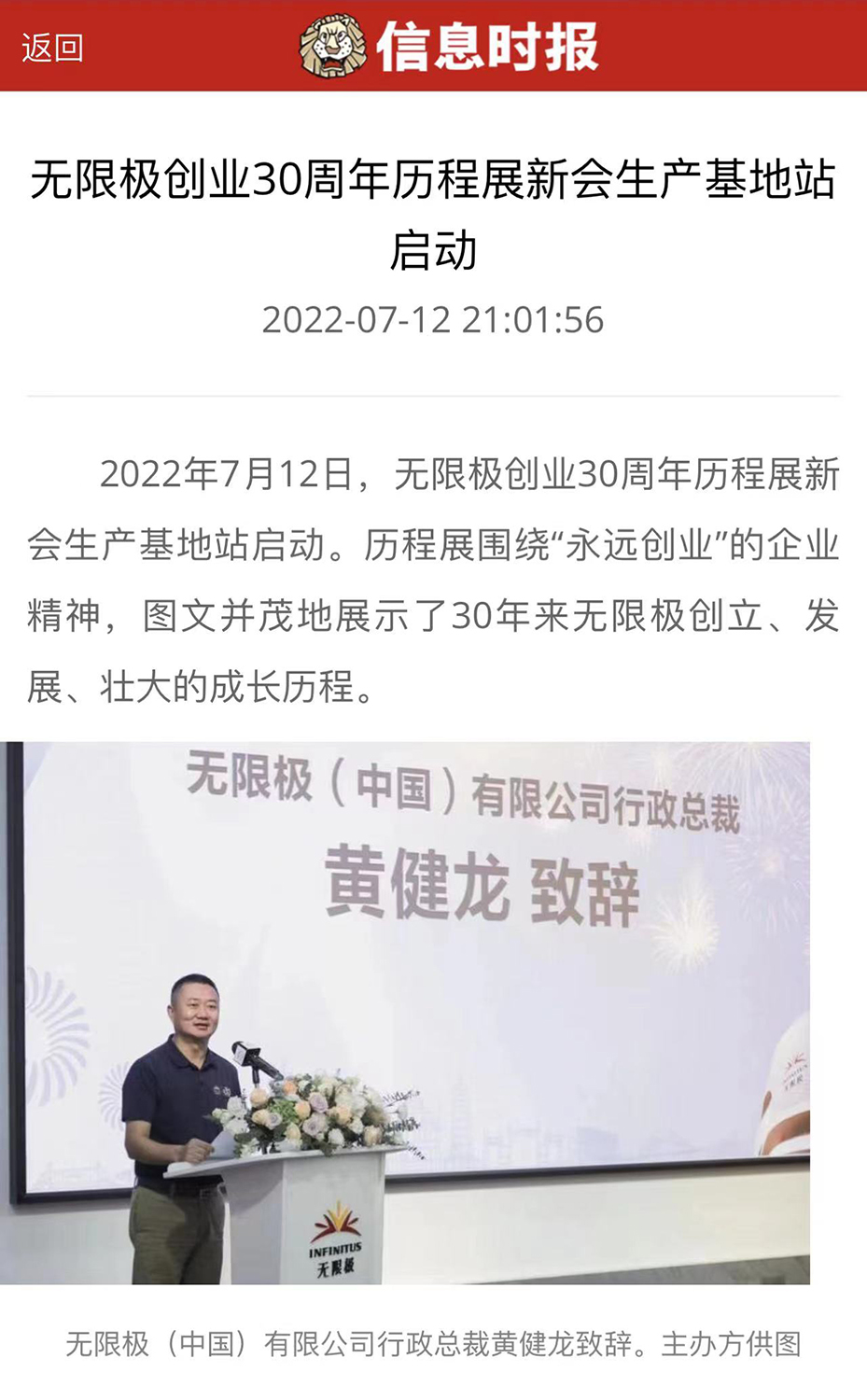 2022年7月12日,无限极创业30周年历程展新会生产基地站启动。历程展围绕“永远创业”的企业精神,图文并茂地展示了30年来无限极创立、发展、壮大的成长历程。