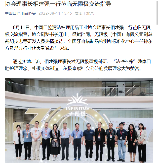 8月11日,中国口腔清洁护理用品工业协会理事长相建强一行莅临无限极交流指导,协会副秘书长江山、盛斌陪同。无限极(中国)有限公司副总裁胡贞忠等研发人员热情接待,全国牙膏蜡制品检测和标准化中心主任孙东方及部分行业代表受邀参与交流。