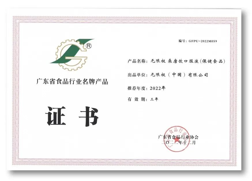 近日,广东省食品行业协会正式发布了2022年度广东省食品行业名牌产品名录,深受广大消费者喜爱的无限极牌桑唐饮口服液榜上有名,获评“2022年度广东省食品行业名牌产品”。