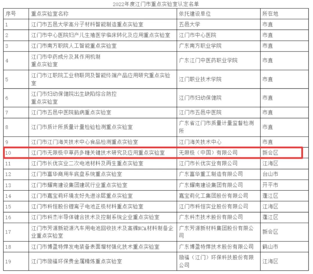 2月22日,江门市高规格召开全市企业高质量发展大会。会上,无限极申报的“江门市无限极中草药多糖关键技术研究及应用重点实验室”与广东省江门市质量计量监督检测所、江门市妇幼保健院等单位申请的19家重点实验室,被授予首批江门市重点实验室。