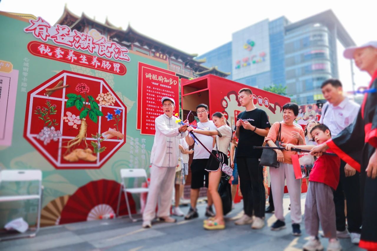 活动现场,新奇有趣的国潮养生趣味打卡点吸引了众多市民游客的目光。“免疫力潮学院”以中式百子柜简约场景打造,通过古方趣味游戏互动,让市民在游玩的同时可以深入了解古方、中草药材知识等,获取实用的“养生干货”;“有益潮食汇”以饮食生活场景打造,互动游戏“千菌一发”让参与者在体验射箭游戏的同时,轻松了解关于益生菌主要健康功效;“心动潮友会”则以运动为主题,运动与养生缺一不可,捶丸、投壶等源自古代的运动游戏让大家一起“动起来”;在“开心潮艺社”,市民游客可以跟着背景板上的指南来一次“懒人拍拍拍”,一起输出压力,排解不良情绪,放松身体,陶冶情志,做健康快乐的自己……
